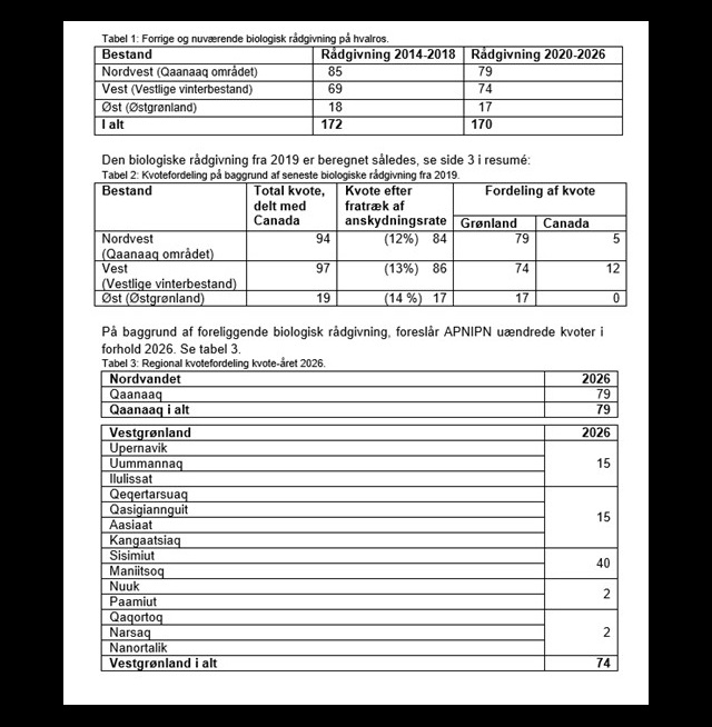 Der er ingen ændringer i forhold til kvoteåret 2025. APNIPN fastsatte i 2025 på linje med biologisk rådgivning hvalroskvoten for Qaanaaq til 79, i Vestgrønland til 74. I Østgrønland er den biologiske rådgivning på hvalroskvoter 17. APNIPN foreslår samme antal hvalros i 2026.