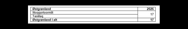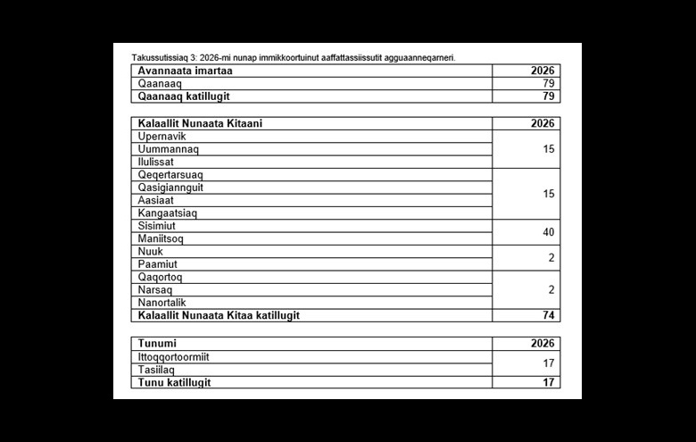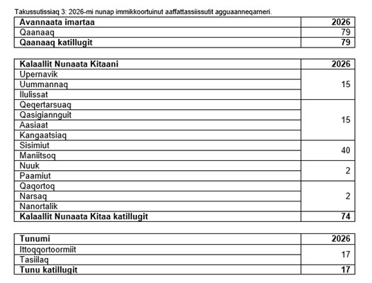 Matumuuna aarrit 2026-mi pisassiissutissat tamanut ammasumik tusarniutigineqarput. Pisassiissutissatut siunnersuutigineqartut 2025-mut sanilliullugit allannguuteqanngillat.